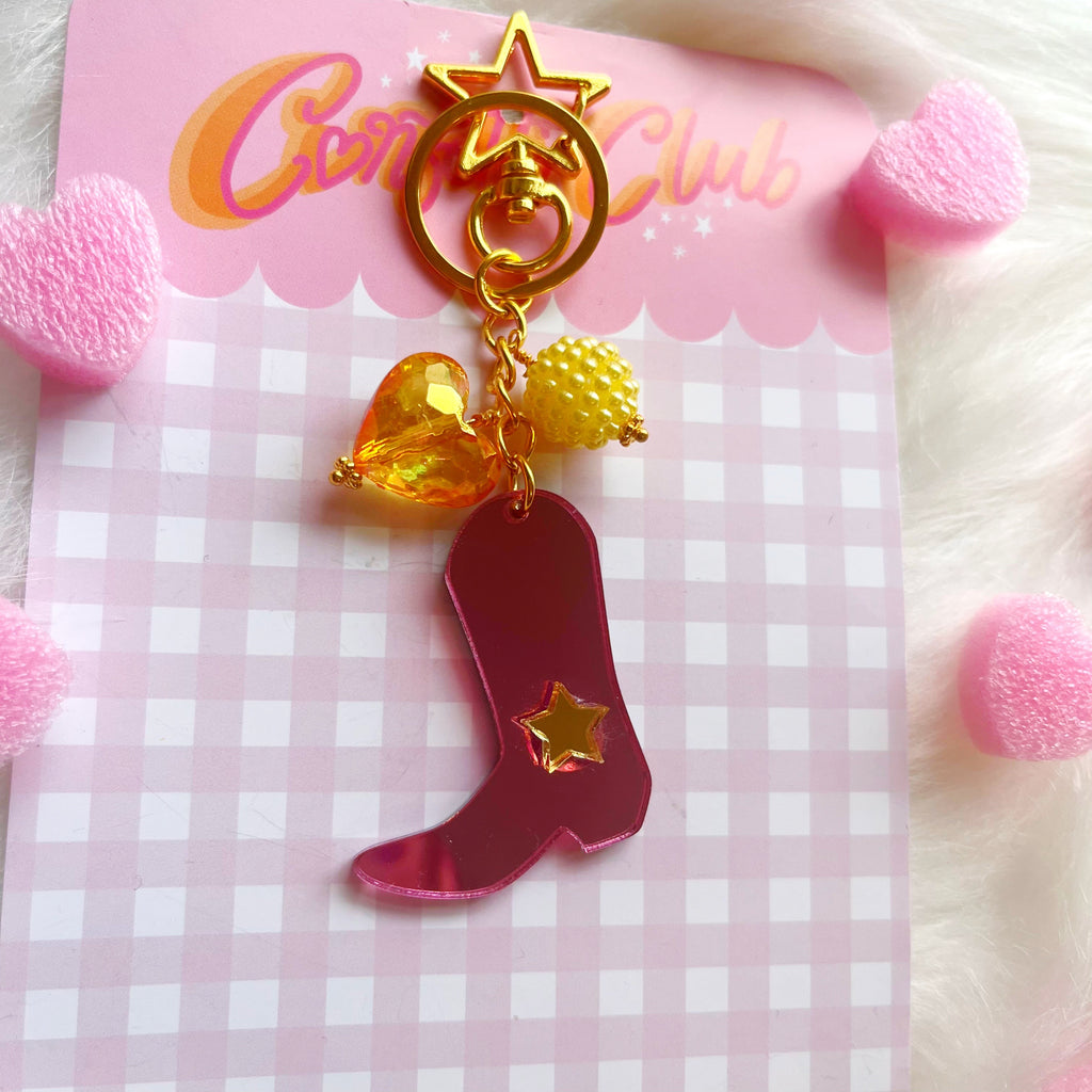 A super cute bag charm made from a pink mirrored acrylic cow girl boot with a gold star, and finished with an iridescent orange heart and yellow beaded charm.