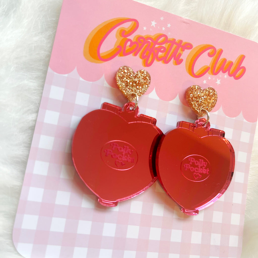 The cutest pink mirror acrylic heart Polly earrings, lightweight and comfortable to wear, on a gold glitter stud.