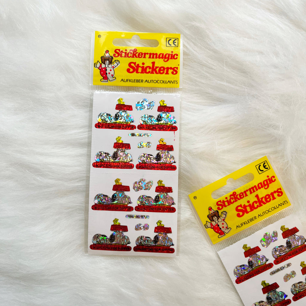 Super cute little sparkly prismatic Snoopy stickers, with the phrase ‘I’m waiting for supper’.