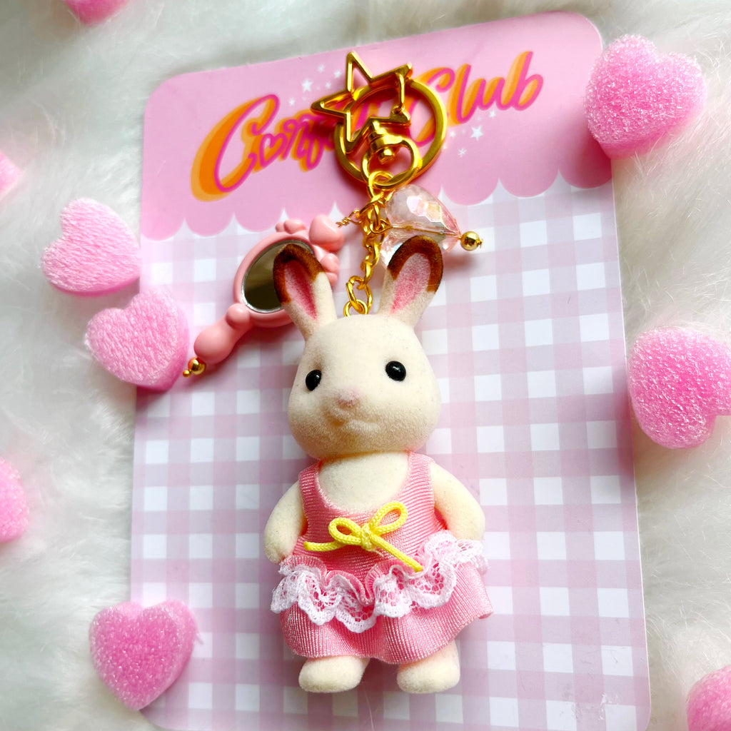 Beautiful Sylvanian bunny bag charm, she’s wearing a pastel pink bow dress, and is finished with a pink mirror charm and an iridescent heart.