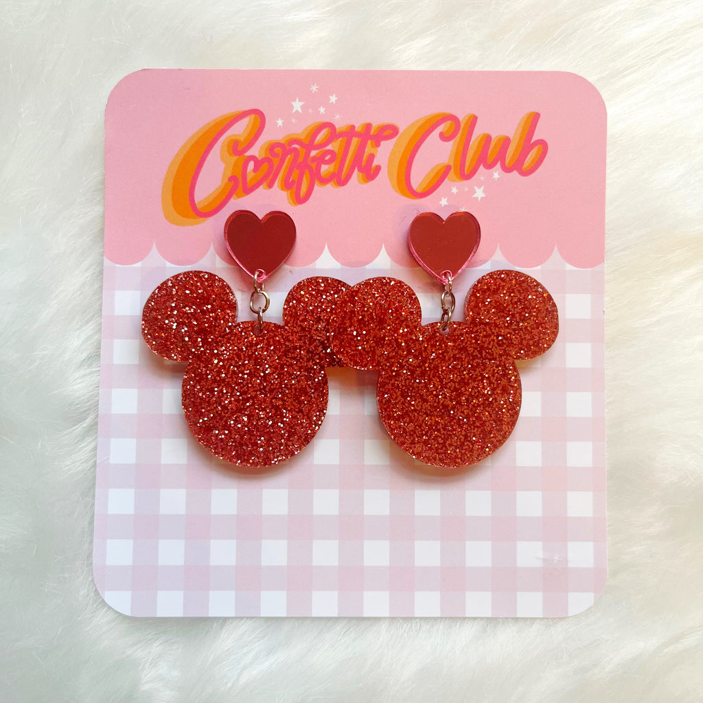 The cutest orange glitter acrylic mouse heads, with a mirrored pink heart stud. Lightweight and comfortable to wear.